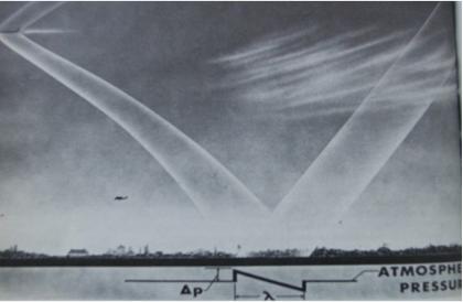 高速飛行的飛行器頭部或突出部出現(xiàn)的激波向外傳播時(shí),會(huì)互相干擾和影響,傳到地面時(shí)會(huì)在地面上反射,形成反射波,反射后激波的強(qiáng)度會(huì)繼續(xù)增加。例如,超聲速飛機(jī)在16000米高空飛行時(shí),它的激波在地面反射時(shí),引起地面上的壓強(qiáng)有可能達(dá)到100帕(10公斤力/平方米)以上,持續(xù)時(shí)間約為0.2秒。激波在地面反射后再傳播到地面上的人們耳朵里時(shí),使耳膜感受到強(qiáng)烈震蕩,讓人們感受到短暫而極其強(qiáng)烈的雷鳴般爆炸聲,這就是音爆產(chǎn)生的機(jī)制。