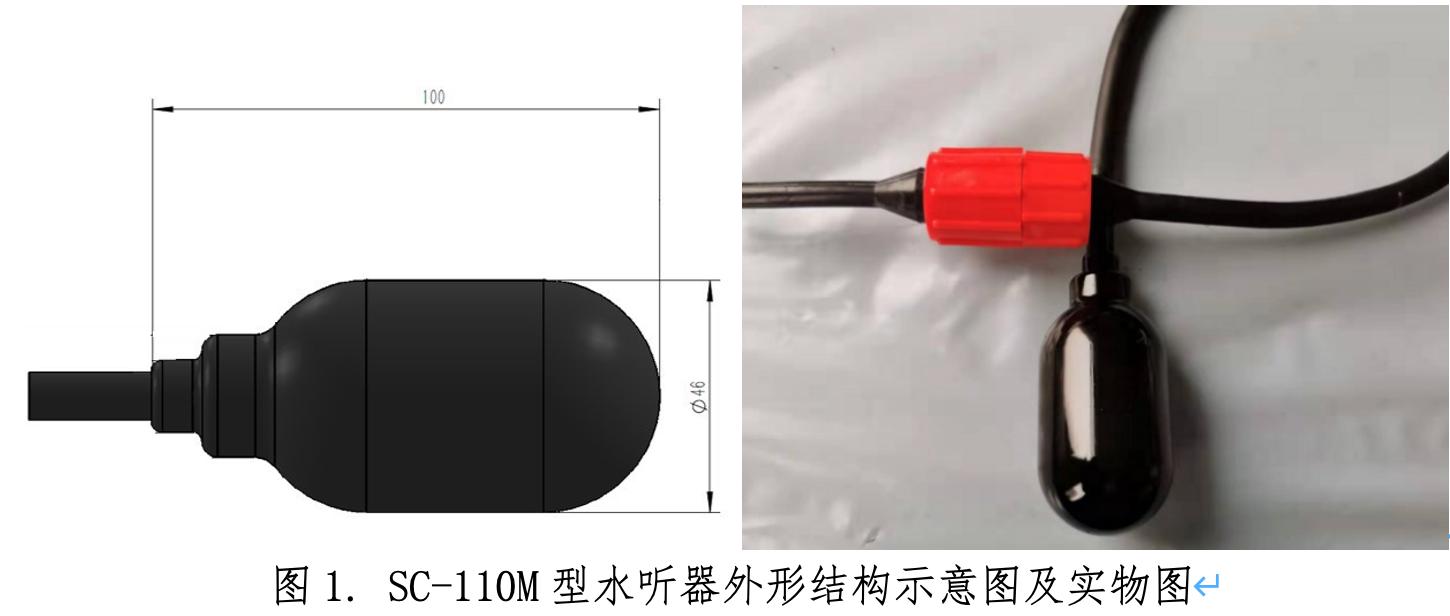 圖1. SC-110M型水聽器外形結(jié)構(gòu)示意圖及實物圖